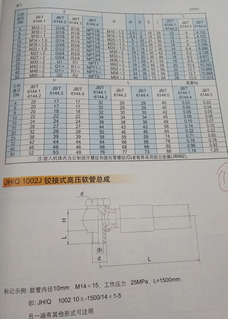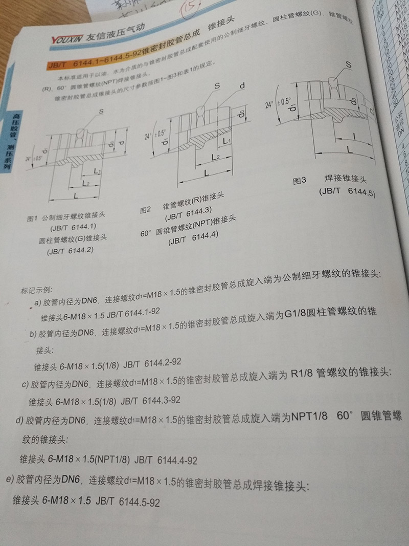 c)膠管內徑為DN6,連接螺紋d1=M18*1.5的錐密封膠管總成旋入端為R1/8管螺紋的錐接頭:錐接頭6-M18*1.5(1/8) JB/T  6144.3-92