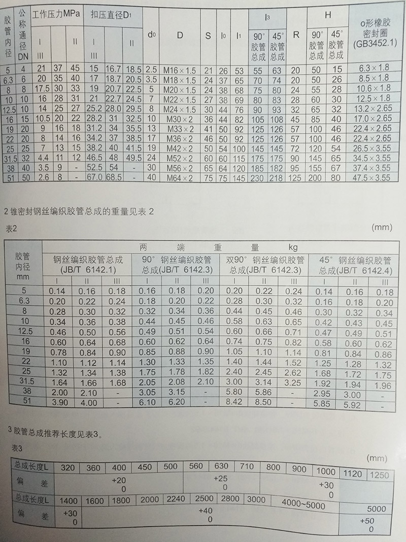 a)膠管內徑為6.3mm,總長度L=1000mm的錐密封|||層鋼絲編織膠管總成: